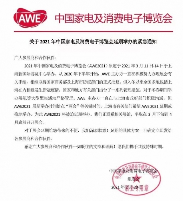 本月22日,AWE官博發布2021年中國家電及消費電子博覽會延期舉辦公告:
