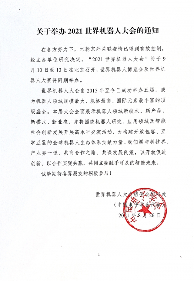 2021世界機器人大會組委會秘書處發布通知,為進一步從嚴從緊做好首都疫情防控工作,最大程度保障所有合作伙伴、與會嘉賓和各界朋友的安全,原定2021年8月18日至22日舉辦的“2021世界機器人大會”延期舉行。日前,在本輪京外關聯疫情得到有效控制下,經主辦單位研究決定, “2021世界機器人大會”將于9月10日至13日在北京重磅重啟,世界機器人博覽會及世界機器人大賽也將同期舉辦。目前,各項籌備準備工作正有序推進。