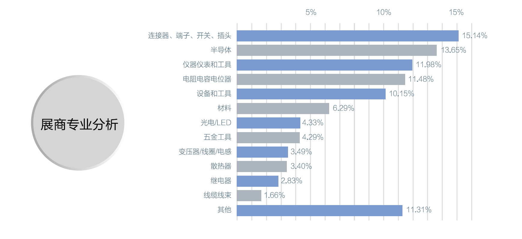 中國電子展始于1964年,自2012年,西部展永久落戶成都后,中國電子展確立了由深圳(春季展)、成都(夏季展)、上海(秋季展)輻射華南、西南和華東三大區(qū)域,基礎(chǔ)電子一直是中國電子展的創(chuàng)展基礎(chǔ),主要有:電阻/電容、變壓器/電感/線圈、電聲器件、連接器/端子/接插件/開關(guān)、繼電器、線纜線束、二極管/三極管/晶體管/晶閘管、傳感器/敏感元件、印刷電路版、電源/電池、微波/射頻器件、EMC器件及系統(tǒng)、諧振器/振蕩器/濾波器、功率器件等,在2012年以后,中國電子展主要展品除了綜合電子元器件和儀器設(shè)備外還增加了消費類電子產(chǎn)品,在歷屆參展商中,半導體分立器件又占了很大比重,是中國電子展的重要展區(qū)。
