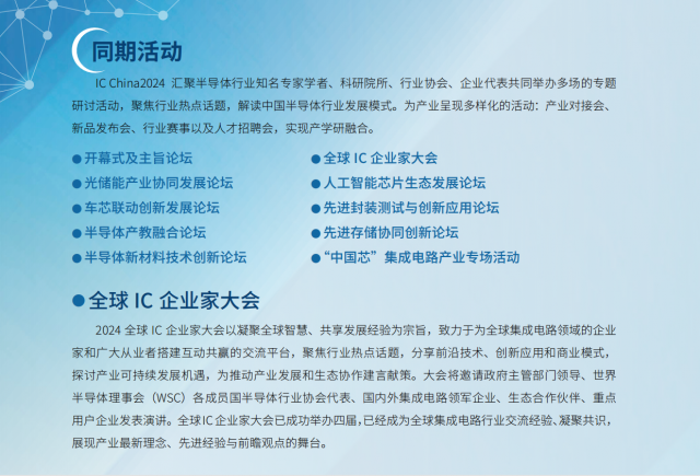 第二十一屆中國國際半導體博覽會(IC CHINA 2024)將依托中國電子信息產業發展研究院和中國半導體行業協會在國際國內的行業號召力、資源組織力和企業凝聚力,將為區域半導體和集成電路產業鏈上下游、產供銷企業精準對接搭建全球化發展橋梁。我們期待與您共同見證半導體產業的繁榮發展和未來趨勢。