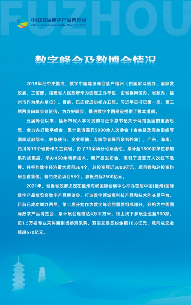 作為數字中國建設峰會中的展覽部分,中國國際數字產品博覽會打造數字領域高科技產品和技術的交易平臺目前已成功舉辦兩屆,第二屆開始作為數字峰會的重要組成部分,升格為中國國際數字產品博覽會,累計展會規模達4萬平方米,線上線下參展企業超900家,超1.5萬名專業采購商到場參觀采購,落實交易簽約金額10.6億元,意向成交金額超670億元。