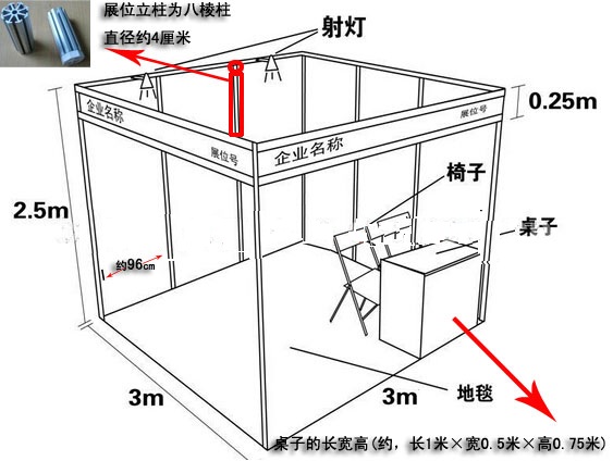 9平米標(biāo)準(zhǔn)展位是展會上最常見的展覽攤位,攤位長寬各3米,高度2.5米左右,攤位一般有主辦方負(fù)責(zé)搭建,