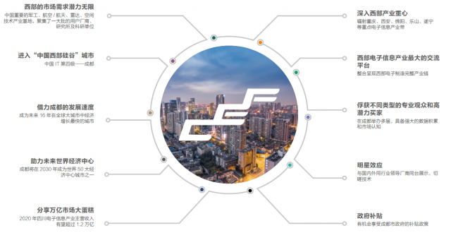 中國(西部)電子信息博覽會已連續在成都舉辦多年,影響力輻射四川、重慶、西安等西部地區,也是華南、華東、華北及國際等電子信息企業挺進西部的重要服務平臺。而做為中國電子展的重要組成部分,中國(西部)電子信息博覽會,依托成都電子信息產業近年來的蓬勃發展,每年定期于7月中旬在成都世紀城國際會展中心舉辦,特別是在大數據、智能制造、數字技術及信息安全是這幾屆成都電子信息博覽會的新亮點。