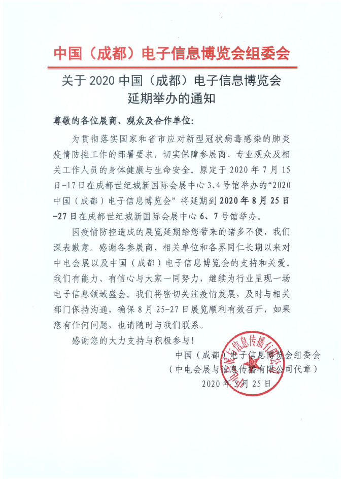 為貫徹落實國家和省市應對新型冠狀病毒感染的肺炎疫情防控工作的部署要求,切實保障參展商、專業(yè)觀眾及相關工作人員的身體健康與生命安全。原定于2020年7月15日-17日在成都世紀城新國際會展中心3、4號館舉辦的“2020中國(成都)電子信息博覽會”將延期到2020年8月25日-27日在成都世紀城新國際會展中心6、7號館舉辦。